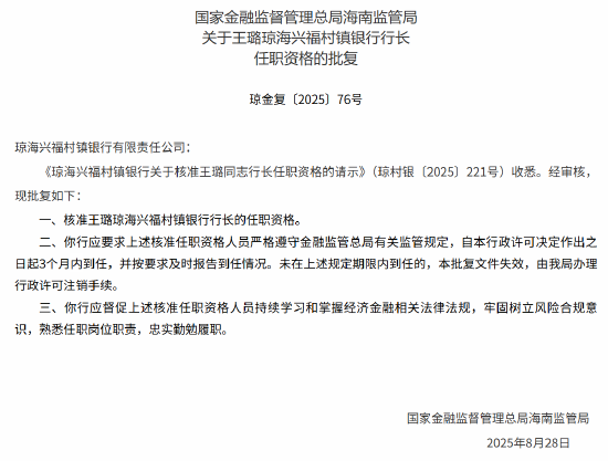 9月2日金融一线消息,国家金融监督管理总局海南监管局发布批复,核准王璐琼海兴福村镇银行行长的任职资格。